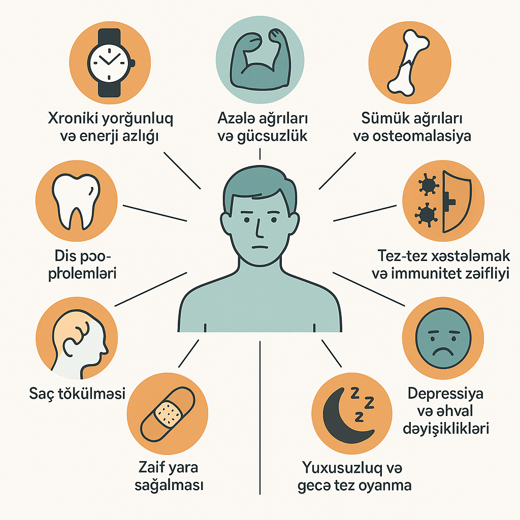 D vitamini çatışmazlığı yalnız sümük sağlamlığına deyil, həmçinin zehni vəziyyətə, immun sisteminə, hormonlara və gündəlik həyat enerjisinə ciddi təsir göstərir. Ona görə də: